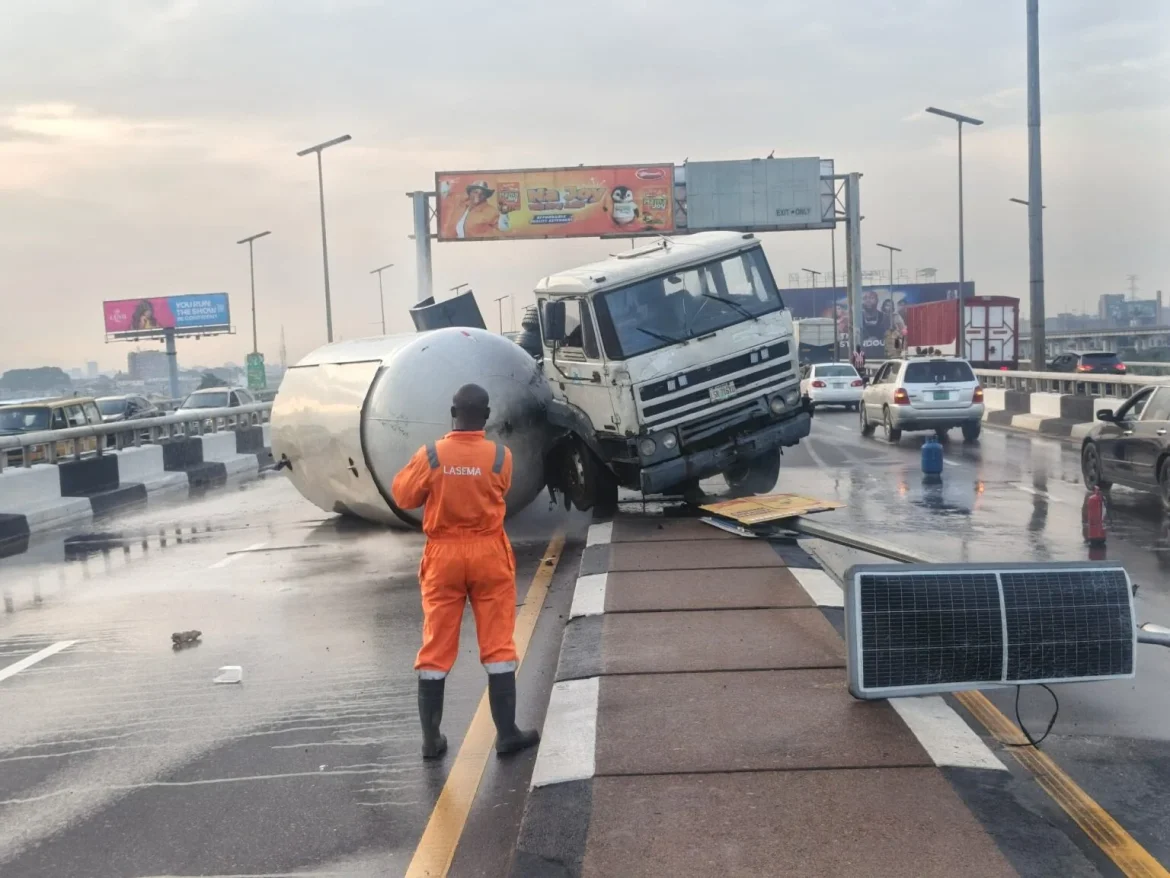 LASEMA confirmed a front tyre burst caused a 10-tonne gas truck to overturn while in motion.
